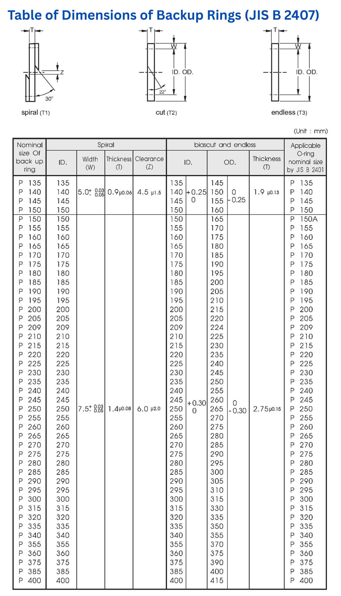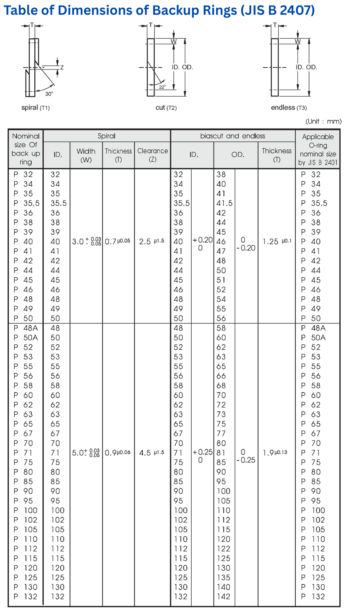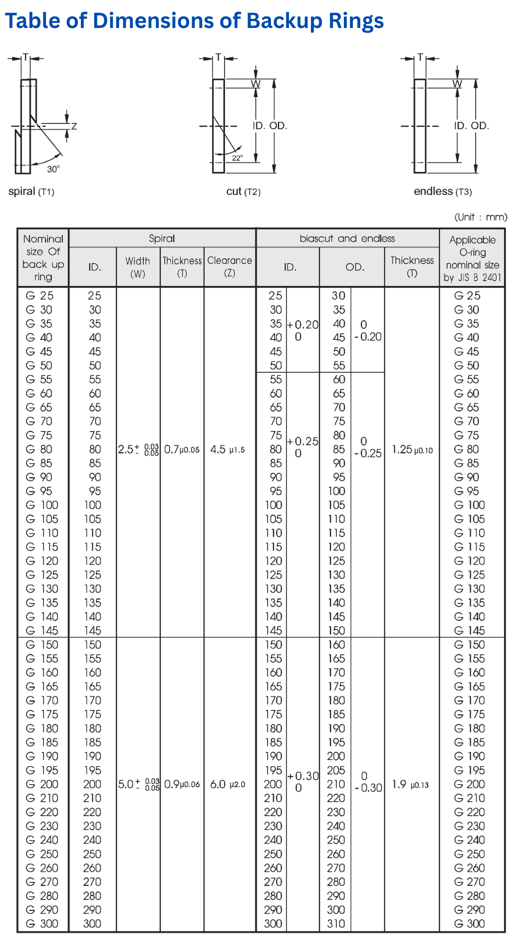 Basically, there are 4 types of back-up rings: flat/uncut, split/angle cut, spiral and contoured back-up rings. PTFE is considered to be the most commonly used material for back up rings. NBR rubber back-up rings are generally for contoured back-up ring to conform to an o-ring.