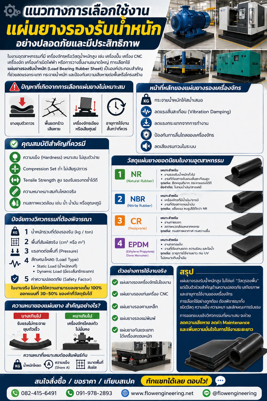 เพื่อความปลอดภัยและประสิทธิภาพในงานอุตสาหกรรม ในงานอุตสาหกรรมที่มีเครื่องจักรหรือวัสดุน้ำหนักสูง เช่น เครื่องปั๊ม เครื่อง CNC เครื่องอัด เครื่องกำเนิดไฟฟ้า หรือการวางชิ้นงานขนาดใหญ่ การเลือกใช้ แผ่นยางรองรับน้ำหนัก (Load Bearing Rubber Sheet) เป็นองค์ประกอบสำคัญที่ช่วยลดแรงกระแทก กระจายน้ำหนัก และป้องกันความเสียหายต่อพื้นหรือโครงสร้าง เหมาะสำหรับ: งานรองรับน้ำหนักทั่วไป และงานที่ต้องการดูดซับแรงสั่นสะเทือนสูง จุดเด่น: ยืดหยุ่นดี กระจายแรงได้ดี เหมาะสำหรับ: เครื่องจักรที่มีน้ำมันหรือจารบี จุดเด่น: ทนน้ำมัน คงรูปได้ดีกว่า NR เหมาะสำหรับ: งานภายนอก พื้นที่ชื้น หรือสภาพแวดล้อมหลากหลาย จุดเด่น: ทนสภาพอากาศได้ดี เหมาะสำหรับ: งานกลางแจ้ง ทนแดด ความร้อน และไอน้ำ จุดเด่น: อายุการใช้งานยาว แต่ไม่เหมาะกับน้ำมัน โดยทั่วไปไม่ควรใช้ค่าความสามารถของวัสดุเต็ม 100% ควรออกแบบเผื่อความปลอดภัยที่ประมาณ 3050% ของค่าที่วัสดุรับได้ แผ่นยางรองรับน้ำหนักสูงเป็นชิ้นส่วนสำคัญที่ช่วยเพิ่มความปลอดภัย เสถียรภาพ และอายุการใช้งานของเครื่องจักร การเลือกใช้งานควรพิจารณาทั้งชนิดวัสดุ ความแข็ง ความหนา และลักษณะการรับแรง เพื่อให้เหมาะสมกับหน้างานจริง ให้บริการในพื้นที่ระยอง ทักแชทได้เลย ตอบไว! 082-415-6491 | 091-978-2893 www.flowengineering.net Line: @flowengineering แผ่นยางรองรับน้ำหนัก, แผ่นยางรองเครื่องจักร, Load Bearing Rubber Sheet, แผ่นยางรองเครื่องจักรหนัก, ยางรองเครื่อง CNC, แผ่นยางรองแท่นเครื่อง, แผ่นยางกันแรงสั่นสะเทือน, แผ่นยางกันกระแทก, ยางรองเครื่องจักรอุตสาหกรรม, ยางรองฐานเครื่องจักร, Rubber Sheet รองน้ำหนัก, แผ่นยางรองคานเหล็ก, แผ่นยางรองแม่พิมพ์, วิธีเลือกแผ่นยางรองเครื่องจักร, แผ่นยางรองน้ำหนัก เลือกยังไง, ยางรองเครื่องจักรแบบไหนดี, แผ่นยางรองเครื่อง CNC ใช้อะไรดี, ยางรองเครื่องจักร ทนน้ำมัน, แผ่นยางรองเครื่องจักร ราคา, ยางรองเครื่องจักร ลดแรงสั่นสะเทือน, Rubber Hardness Shore A, Compression Set Rubber, Tensile Strength Rubber Sheet, Vibration Damping Rubber, Static Load, Dynamic Load, Safety Factor Engineering, จำหน่ายแผ่นยางรองเครื่องจักร, สั่งทำแผ่นยางรองน้ำหนัก, แผ่นยางอุตสาหกรรม ราคา, ยางรองเครื่องจักร พร้อมส่ง, รับตัดแผ่นยางตามขนาด, แผ่นยางรองเครื่องจักร ระยอง, ยางรองเครื่องจักร ระยอง, แผ่นยางอุตสาหกรรม ระยอง, ร้านขายแผ่นยาง ระยอง, Rubber Sheet ระยอง, จำหน่ายแผ่นยางรองน้ำหนัก ระยอง, ยางรองเครื่อง CNC ระยอง, แผ่นยางกันกระแทก ระยอง, แผ่นยางรองแท่นเครื่อง ระยอง, โรงงานยางอุตสาหกรรม ระยอง, แผ่นยางรองเครื่องจักร มาบตาพุด, ยางรองเครื่องจักร มาบตาพุด, แผ่นยางอุตสาหกรรม มาบตาพุด, Rubber Sheet มาบตาพุด, ยางรองเครื่องจักรโรงง