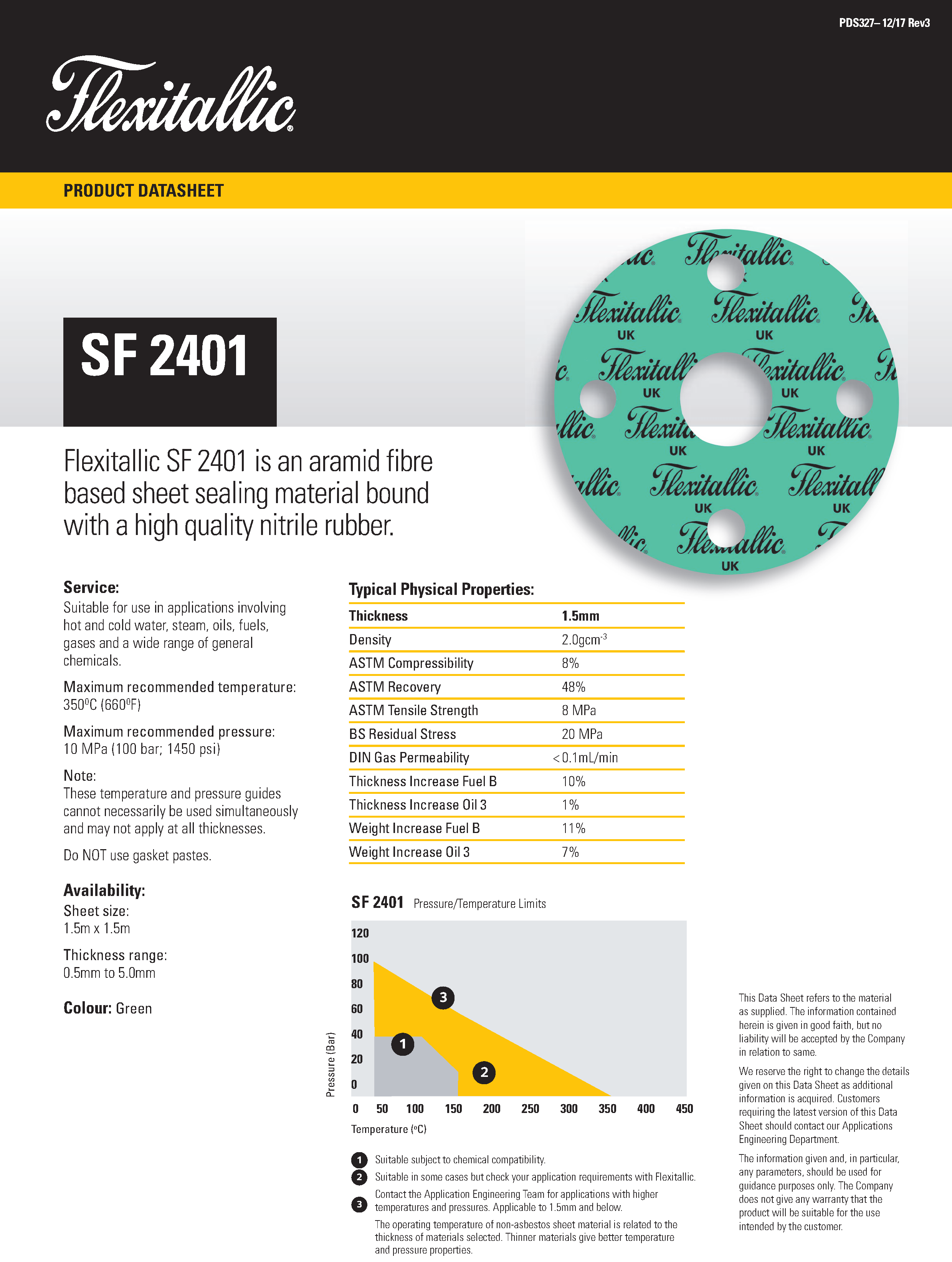 When it comes to internationally trusted non-asbestos gaskets, Flexitallic SF 2401 is the perfect solution. Manufactured from high-quality aramid fibres bonded with nitrile rubber, this gasket delivers outstanding properties for any application.