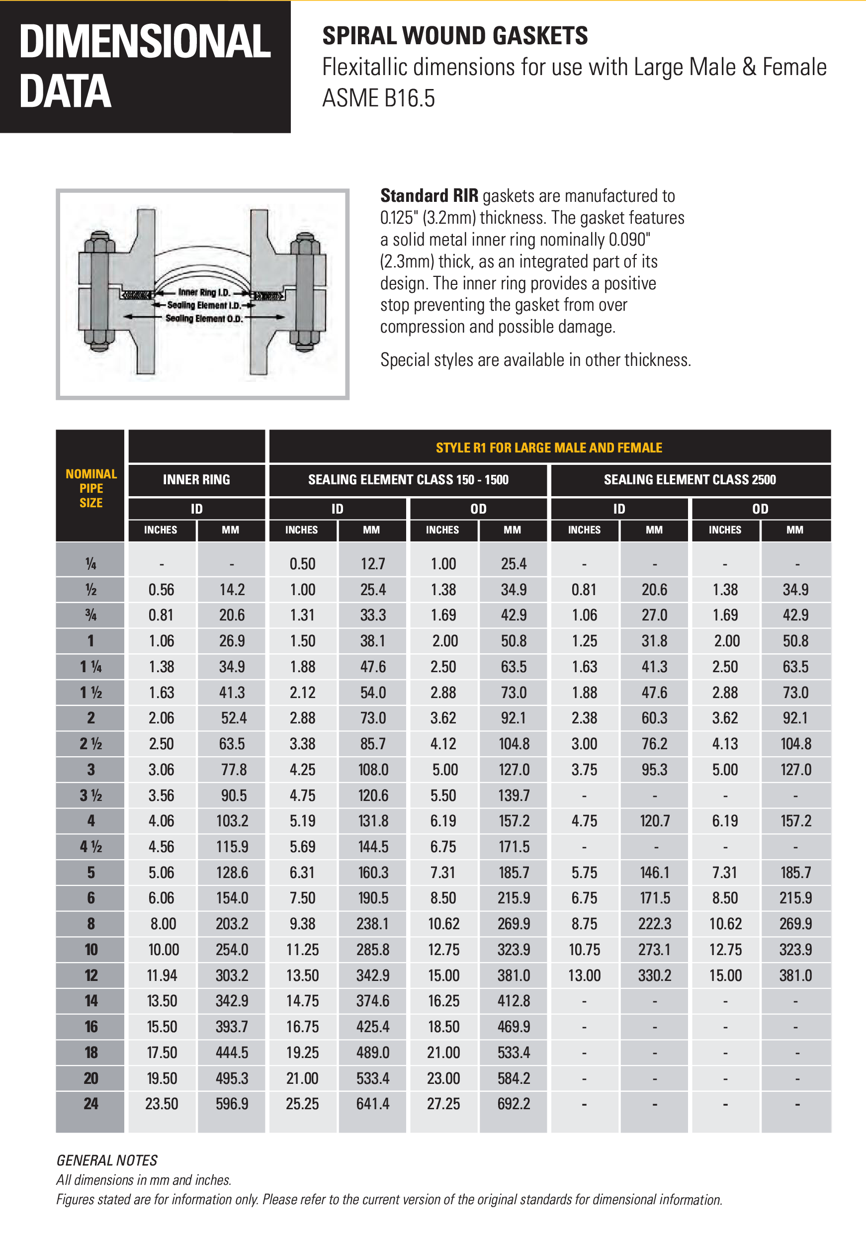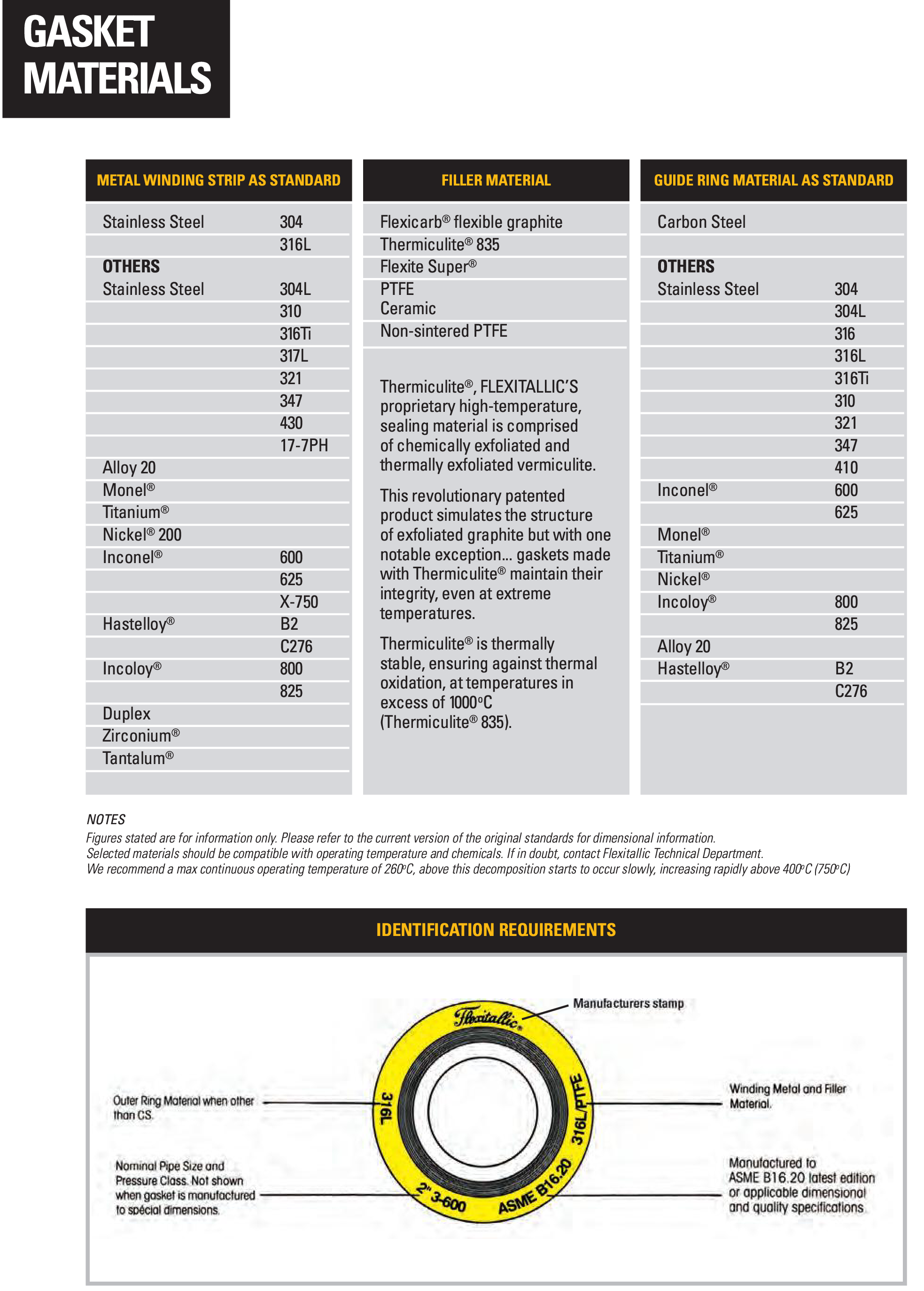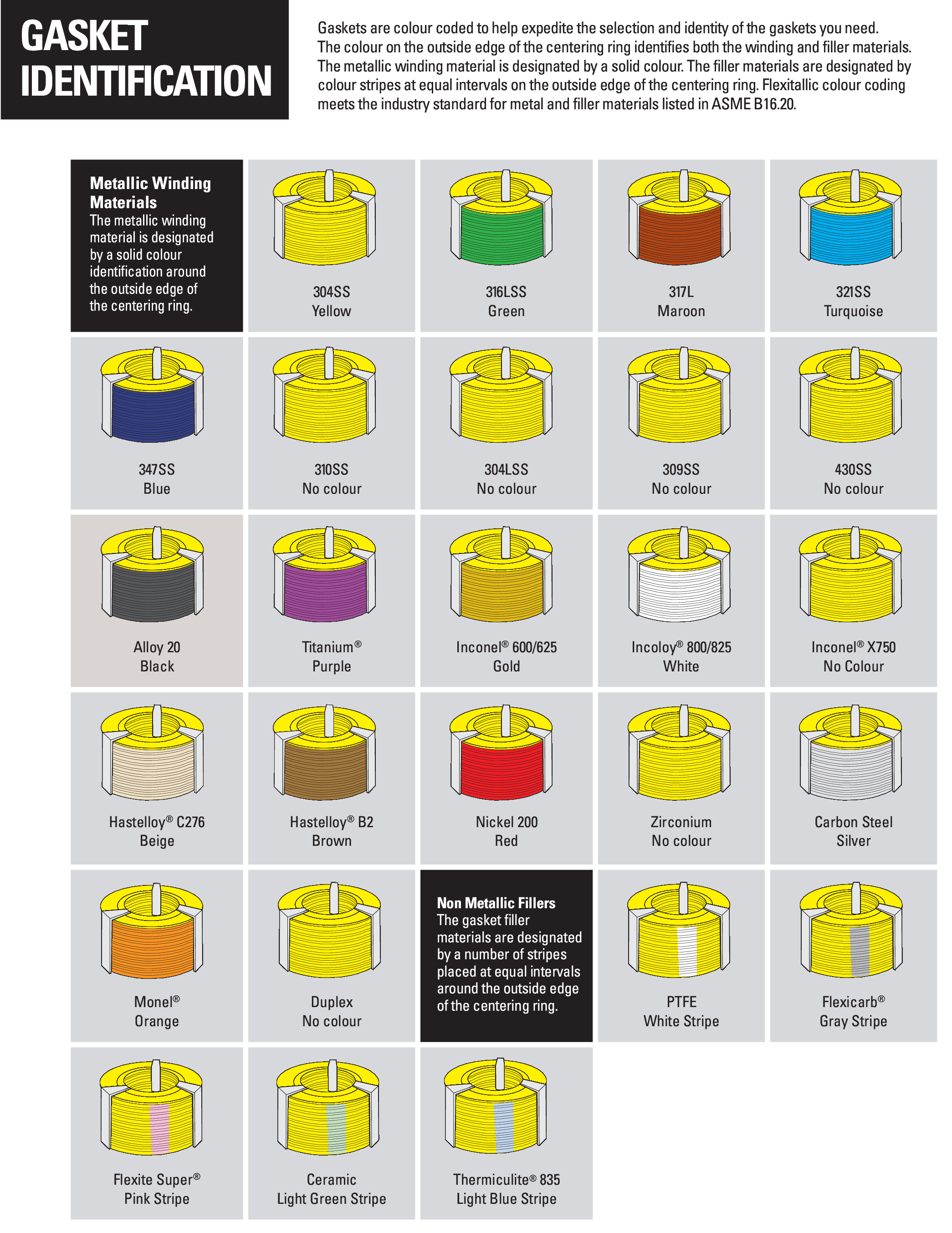 Gaskets are colour coded to help expedite the selection and identity of the gaskets you need.The colour on the outside edge of the centering ring identifies both the winding and filler materials.The metallic winding material is designated by a solid colour. The filler materials are designated bycolour stripes at equal intervals on the outside edge of the centering ring. Flexitallic colour codingmeets the industry standard for metal and filler materials listed in ASME B16.20.